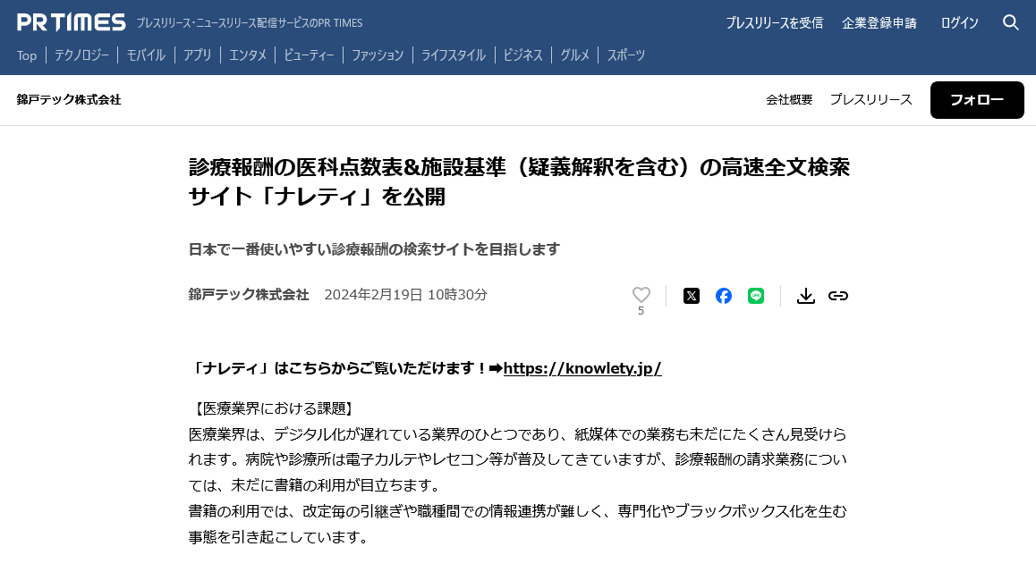 PR Timesにてプレスリリースを配信しました。 お知らせ2024.02.192024.06.29診療報酬の医科点数表&施設基準(疑義解釈を含む)の高速全文検索サイト「ナレティ」を公開錦戸テック株式会社のプレスリリース(2024年2月19日 10時30分)診療報酬の医科点数表&施設基準(疑義解釈を含む)...